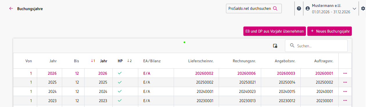 Beim ersten Einstieg in ProSaldo.net wird automatisch ein Buchungsjahr für das aktuelle Jahr angelegt. Möchtest du eine Buchhaltung für ein Vorjahr aufbuchen, kannst du natürlich jederzeit eine neues Buchungsjahr für das entsprechende Jahr anlegen.