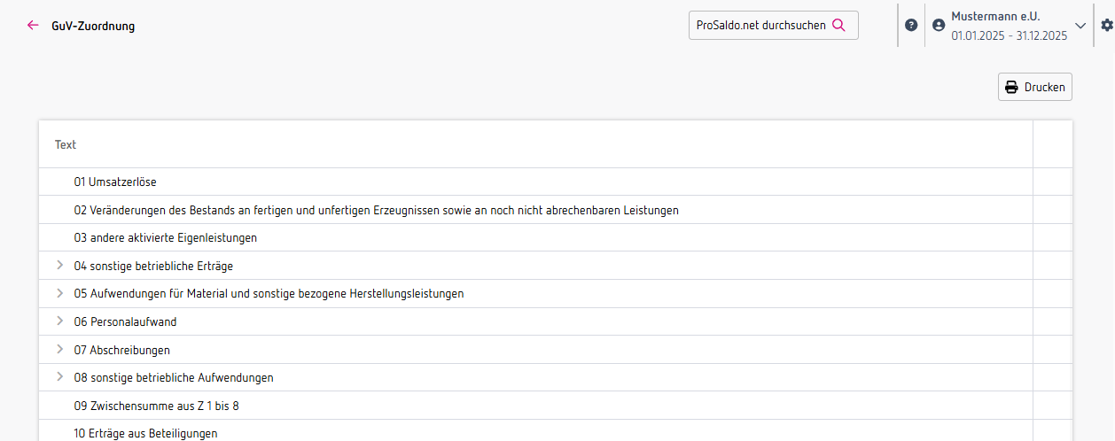 Du siehst eine Übersicht über die vorhandenen Zuordnungen. Die GuV-Gliederung kannst du mit dem Button "GuV-Struktur drucken" ausdrucken.