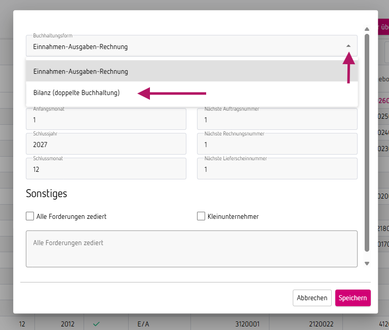 1. Die Buchhaltungsform änderst du, indem du beim Anlegen der neuen Buchungsperiode die Buchhaltungsform "doppelte Buchhaltung" auswählst. Hier achte auch auf die Nummernkreise, das du diese nach deinem gewünschten Schema einstellst.